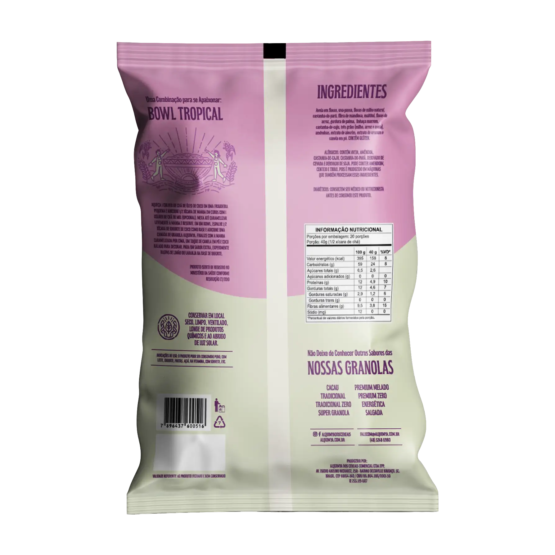 Aveia em flocos, uva-passa, flocos de milho natural, castanha-do-pará, fibra de mandioca, maltitol, flocos de arroz, gordura de palma, linhaça marrom, castanha-de-caju, três grãos (milho, arroz e aveia), amêndoas, extrato de alecrim, extrato de urucum e canela em pó. CONTÉM GLÚTEN.